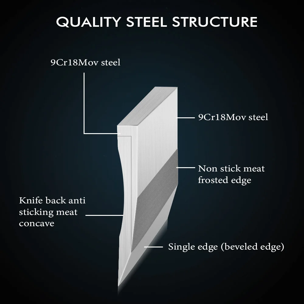 This 10.5 Inch Chef Fish Raw Knife is expertly designed for precision slicing and professional kitchen performance. Crafted from X9Cr18MoV stainless steel, the blade delivers exceptional sharpness, excellent edge retention, and strong corrosion resistance. Its long, narrow profile allows for smooth, clean cuts that preserve the texture and appearance of raw fish.