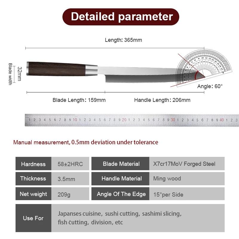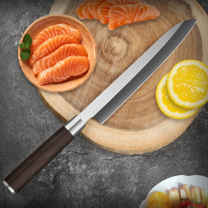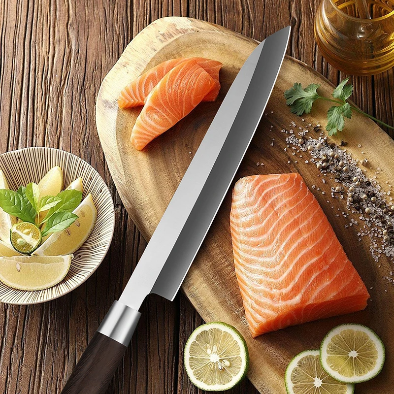 Lightweight yet sturdy, it offers excellent balance and control for precise cutting. Perfect for chefs and culinary enthusiasts, it enhances the efficiency and enjoyment of food preparation. Durable, sharp, and reliable, this sashimi knife is a must-have for anyone serious about seafood and fine slicing tasks.