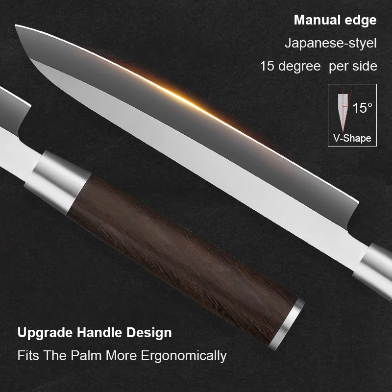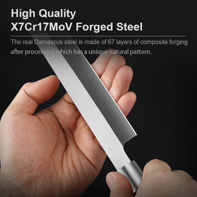 This 8 Inch Sashimi Knife is crafted for precision and professional kitchen performance. The X7Cr17MoV stainless steel single-edged blade ensures sharpness, durability, and corrosion resistance, allowing clean, effortless cuts for fish and seafood. Its blade design preserves the texture and integrity of delicate ingredients during slicing.