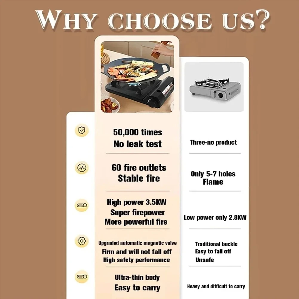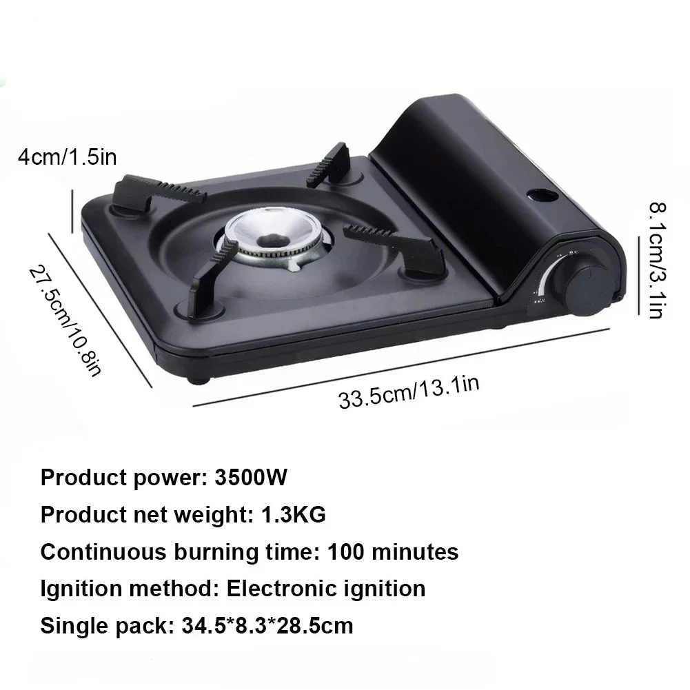 This Portable Single Burner Camping Gas Stove delivers powerful, reliable cooking performance for both indoor and outdoor use. Designed with automatic ignition, it lights instantly without the need for matches or lighters. The compact cassette-style design makes it easy to pack, carry, and store for camping, hiking, picnics, and emergency use. Its sturdy burner provides stable heat for boiling water, cooking meals, or heating food on the go. Built with durable materials, the stove withstands frequent use and outdoor conditions. The adjustable flame control lets you fine-tune heat output for precise cooking. Compatible with standard gas canisters, it’s ready for quick setup anytime. Ideal for travelers, campers, and outdoor enthusiasts, it brings convenience to any adventure. The wind-resistant design ensures steady performance in various weather conditions. Enjoy fast, efficient cooking wherever your journey takes you.